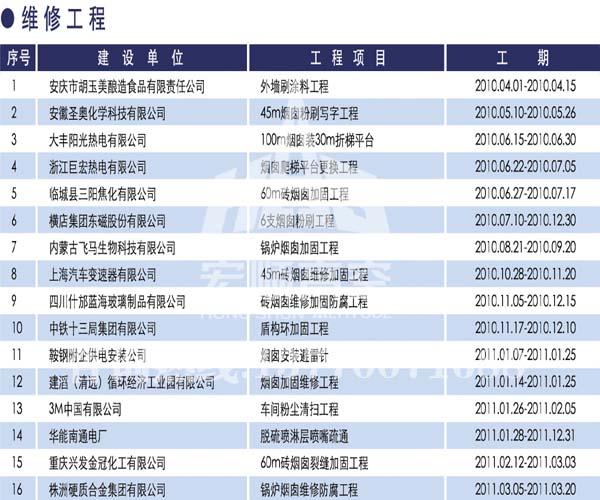 宏順建設(shè)工程有限公司是國家批準(zhǔn)成立的專業(yè)高空作業(yè)企業(yè):承攬過(國內(nèi).國外)煙囪新建、煙囪防腐、吊機(jī)防腐、水塔防腐、管道防腐、龍門吊防腐、儲(chǔ)存罐防腐、煙囪內(nèi)壁防腐等高空作業(yè)工程。具有“不搭腳手架 、 不需要停產(chǎn)”施工特點(diǎn)。